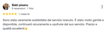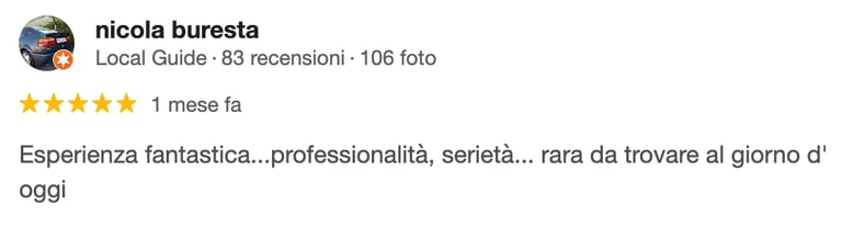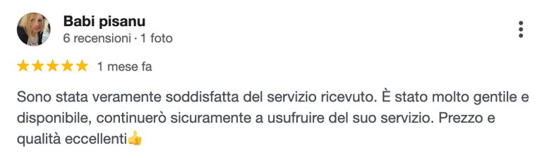 Le recensioni che trovi qui sotto provengono direttamente da Google e rappresentano esperienze reali di persone che hanno scelto i nostri servizi. Ogni opinione è per noi un’importante conferma del lavoro svolto con professionalità, trasparenza e attenzione ai dettagli.
